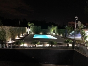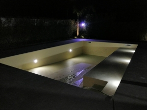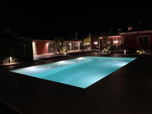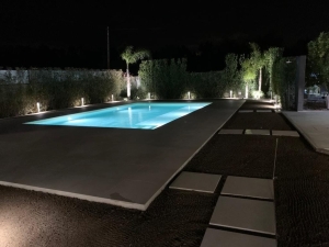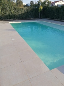No projeto realizado inclui a área de passeio envolvente à piscina, todo acabamento é em cerâmica antiderrapante.