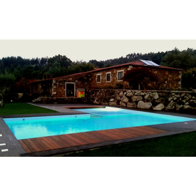 Composta por uma ( praia ) iluminada com 0,35 cm de água para aplicação de espreguiçadeira, no seguimento da praia dispõem de uma adaptação ( jacuzzi ) tornando a piscina um espaço completo para desfrutar o máximo dos dias de calor.